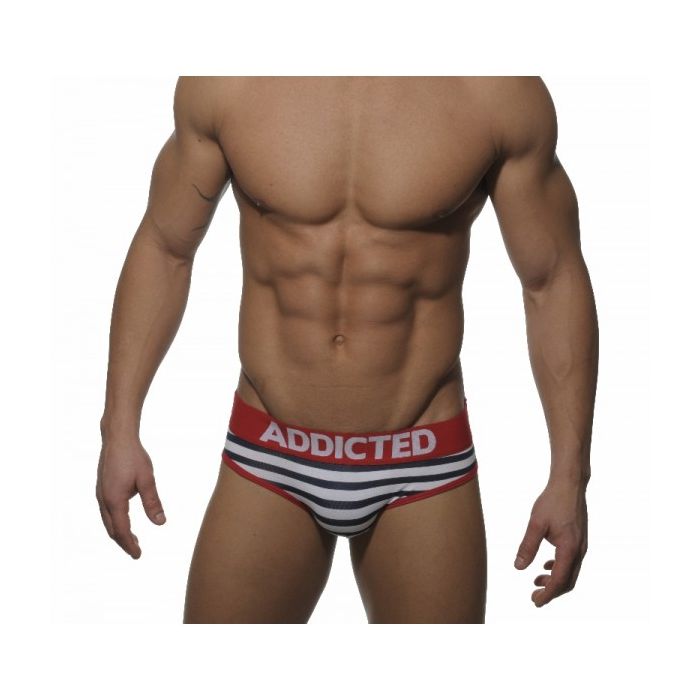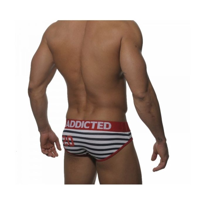 De AD141 Sailor Brief van Addicted heb jij gauw 'in ieder stadje een ander schatje'. Het is een low-cut square model dat zeer comfortabel zit doordat Addicted gebruik heeft gemaakt van de beste materialen. Het streepjespatroon in navy blauw met wit en de rode accenten maken deze brief helemaal af. Het Addicted logo is zowel aan de voorkant als aan de achterkant aangebracht op de rode tailleband. Verder zijn de zomen rondom de benen gemaakt in het rood en aan de achterkant links is in het rood het cijfer "20" aangebracht. Speel, verleid en trek de aandacht met deze Sailor Brief van Addicted.