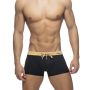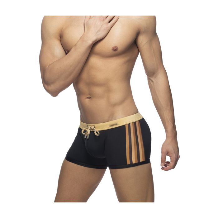 De Addicted Black Striped Zwem Short - Goud heeft een nauwsluitende pasvorm en een stijlvolle retro look. De zwarte zwembroek heeft een lage, tailleband in gouden kleur met rijgveter en silicone Addicted logo. Op de zijkanten zijn sportieve strepen aangebracht die en retro uitstraling geven.