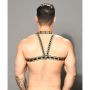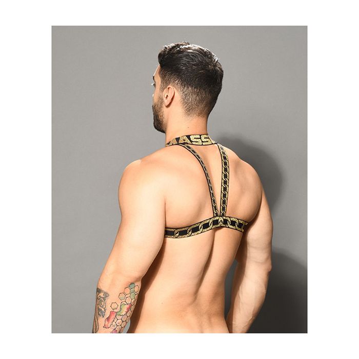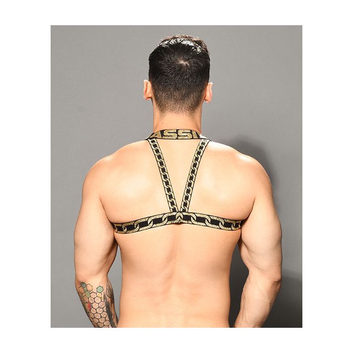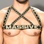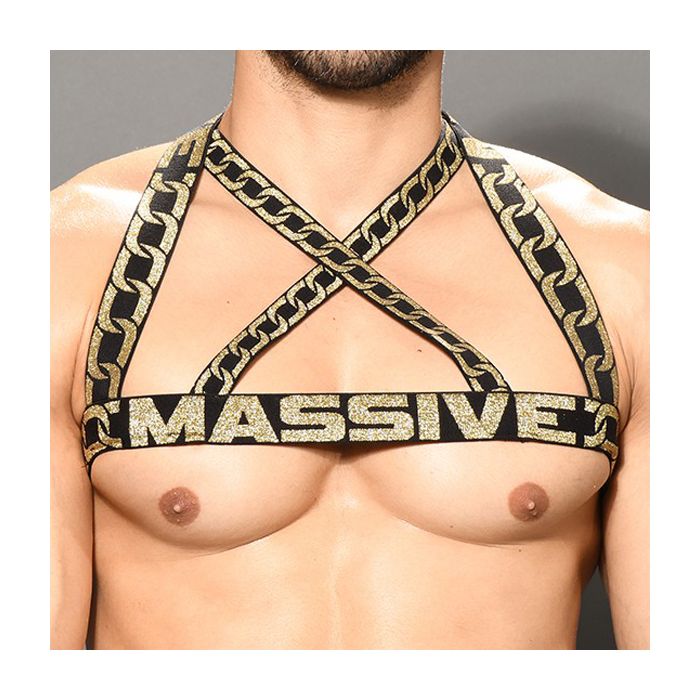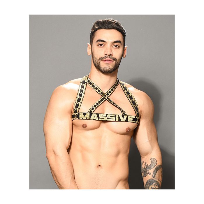 Ga voor een MASSIVE schouderpartij in het MASSIVE Chain Harnas van Andrew Christian. De elastische banden rond de schouders en de borst laten jouw gespierde schouders nog breder lijken. De elastische banden zijn versierd met geweven kettingen en het woord MASSIVE in goudkleurig garen.