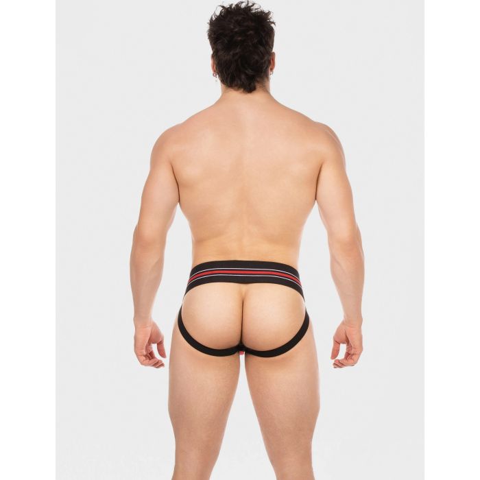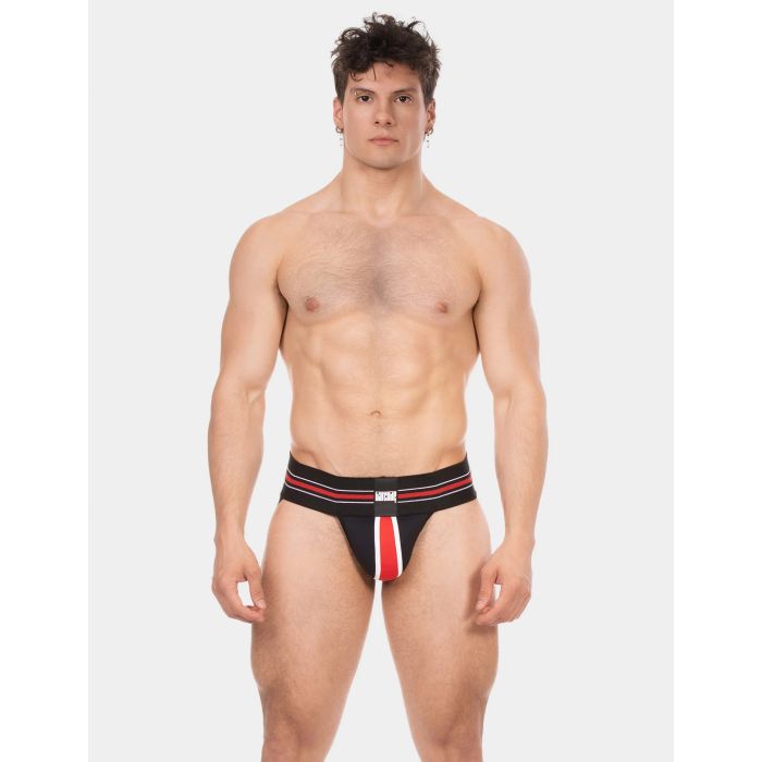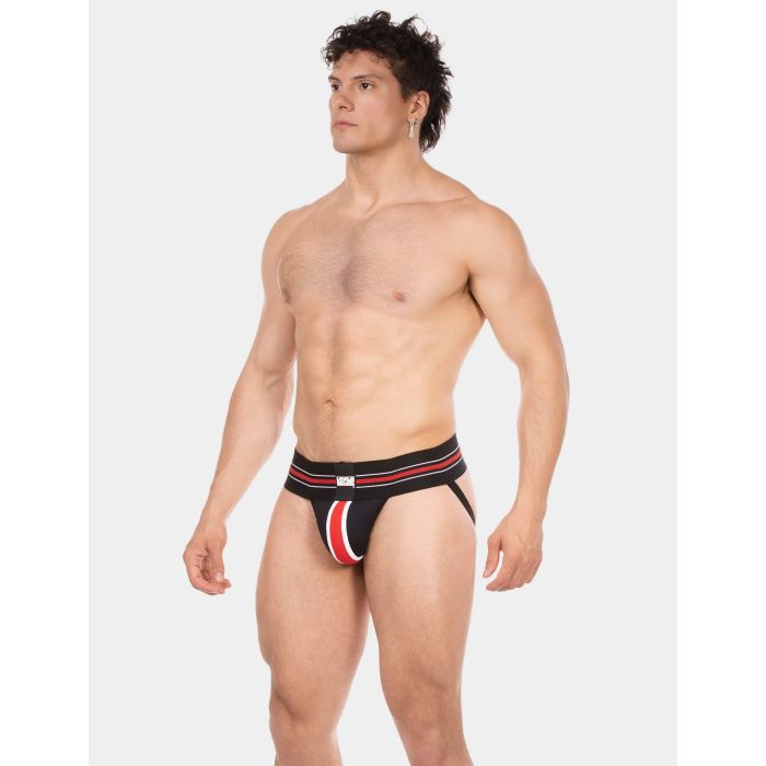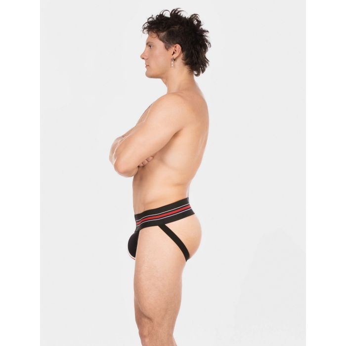 De Barcode Jock Denis in zwart, rood en wit is de ultieme combinatie van stijl en functionaliteit! Deze atletische jockstrap heeft een brede elastische tailleband met trendy gestreepte details en een opvallende logo patch. De contoured front pouch biedt niet alleen lift en ondersteuning, maar de versterkte naden zorgen ook voor extra duurzaamheid. Met een open achterkant en comfortabele beenbanden is deze jockstrap perfect voor elke sportieve gelegenheid. Upgrade je sportoutfit en ervaar het comfort en de stijl die je verdient!