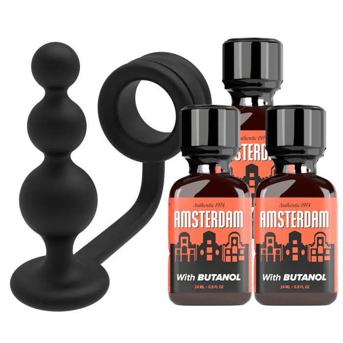 - Complete combiset: penisring met anale plug + 3 flesjes Amsterdam Butanol Poppers
