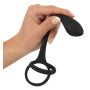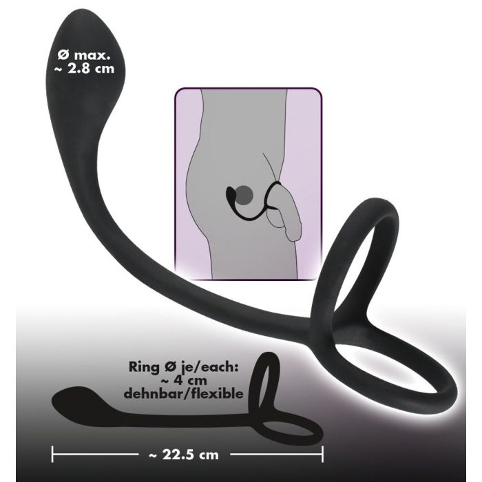 Ga voor drievoudige stimulatie. Met deze zwarte buttplug van Black Velvets zul je niet alleen genieten van een heerlijke prostaatstimulatie, maar ook van een keiharde pik die lekker lang hard blijft! De geïntegreerde cock- en ballringen worden daarom om je pik en ballen gedaan. De anaalplug heeft een verdikte kop voor gerichte stimulatie van de prostaat. De smalle schacht van de plug gaat soepel over in een verbindingsstuk met de cock- en ballringen, dit gedeelte dient er ook voor om het perineum te stimuleren.
