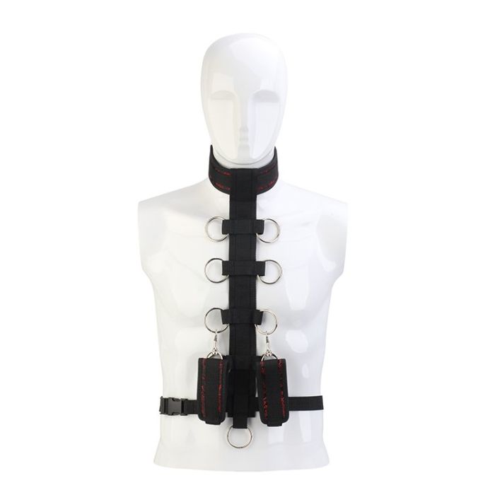 De Body Collar Blaze Deluxe is perfect voor een kinky BDSM-avond. Dankzij de verstelbare halsband, handboeien en tailleband kun je het geheel volledig op maat afstellen. De afneembare kraag en de negen stevige O-ringen bieden mogelijkheden om andere BDSM-accessoires te bevestigen, zoals kettingen of gewichten. Het luxe ontwerp met rode borduursels maakt het niet alleen functioneel, maar ook visueel aantrekkelijk. Draagbaar aan zowel de voor- als achterkant van het lichaam, deze body collar combineert comfort, veiligheid en kinky plezier.