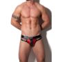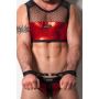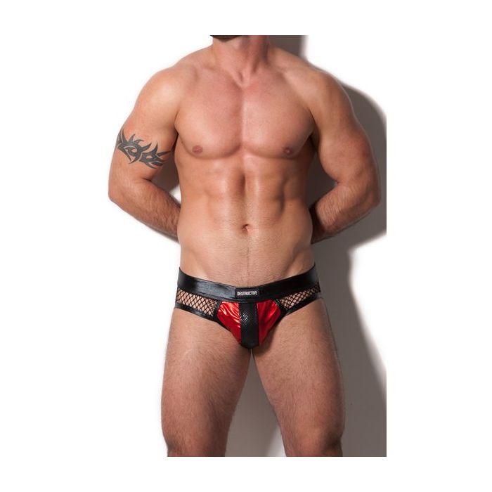 Op de elastische, kunstleren tailleband is het Destructive logo af te lezen. Rondom is de slip gemaakt van grof mesh, waarin jouw lekkere kontje op smakelijke wijze gepresenteerd wordt. De comfortabele buidel is gemaakt van opvallend rode stof met een strook nep slangenleer over het midden. De buidel zal dan ook zeker de aandacht trekken.