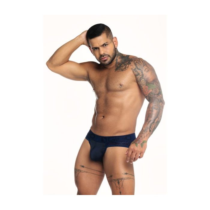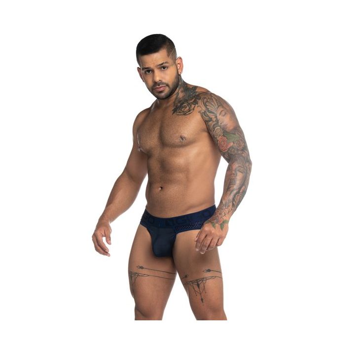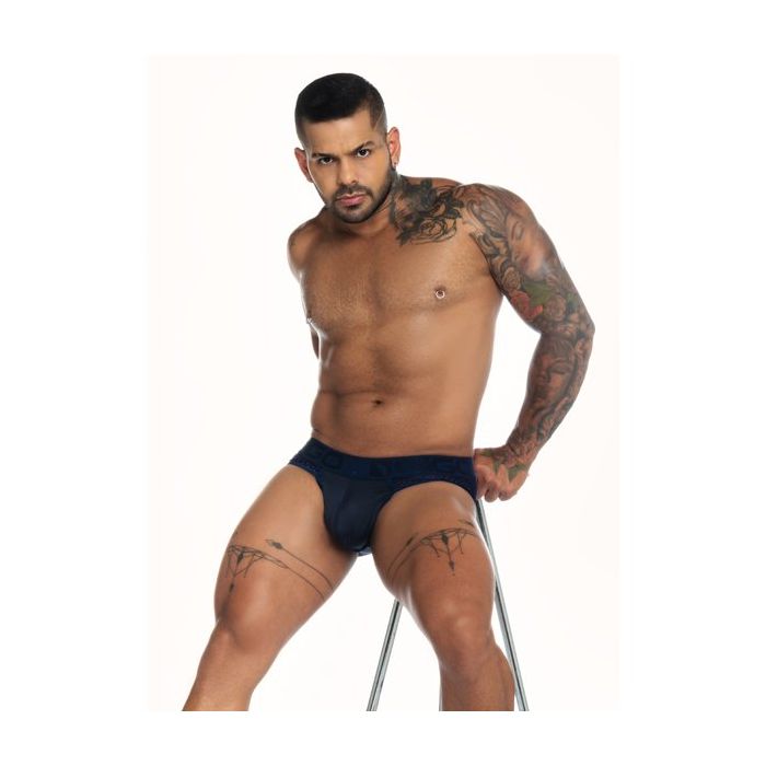 De slip heeft een brede tailleband van elastisch materiaal. In de tailleband is het GIGO logo geborduurd en de tailleband zit laag om de heupen voor een sexy look. De buidel heeft een comfortabele pasvormen is gemaakt van ondoorzichtige stof. Over de heupen loopt mesh door naar de achterkant vaan een kinky inkijkje in de slip.