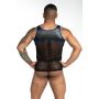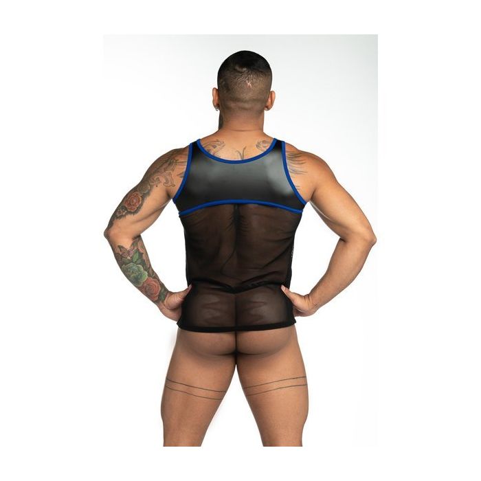 De GIGO Tank - Fetiche Blue uit de Fetish lijn van het merk GIGO is een mouwloze model laat jouw schouders extra verleidelijk uitkomen. De tank is gemaakt van gladde rekbare stof en micro mesh. De stretch stof sluit goed aan om de schouders en de randen zijn afgewerkt met blauwe zomen. De torso wordt bedekt met semi-transparant micro mesh voor een super sexy effect. Hierin komen jouw abs goed tot hun recht! Niemand zal jouw sexy body kunnen weerstaan wanneer jij verschijnt in de Tank Fetiche Blue van GIGO.