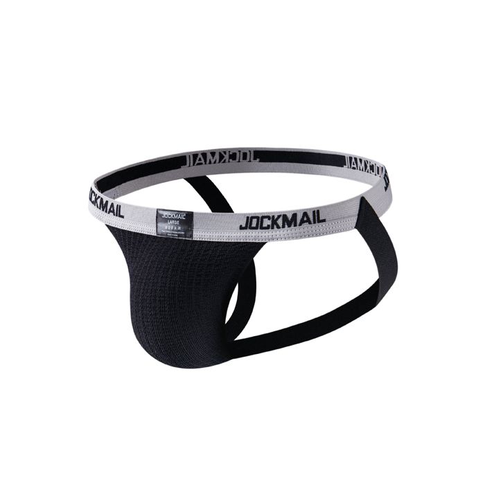 Ga voor een sportieve look en een hoog draagcomfort met de JM229 Gray Narrow Strap Jock - Zwart van Jockmail. Deze klassieke jockstrap heeft een sportief uiterlijk door de smalle grijze tailleband met Jockmail logo. Aan de voorkant is de maatlabel aangebracht, wat deze jockstrap een unieke look geeft.