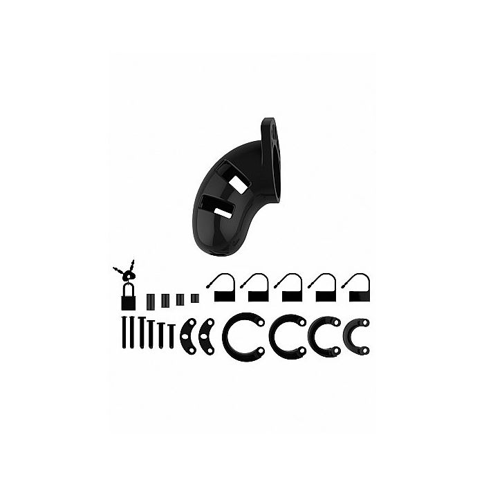 Bij de Mancage 01 Kuisheidskooi hoort een uitgebreide set aan diverse sleutels, pennen en slotjes. De kooi is volledig op maat te maken en bestaat uit drie delen die op elkaar aansluiten. Met een borgpen en ringen kun je zijn pik heel eenvoudig insluiten. Het is geen ingewikkeld bouwpakket hoor, in één handomdraai zet je hem vast. Er zitten overigens genoeg ventielatieopeningen in de kooi en plassen lukt ook prima. Wel zo handig en hygiënisch. Maar zijn seksuele lusten heb jij onder controle, en daar gaat het om tijdens dit spel.