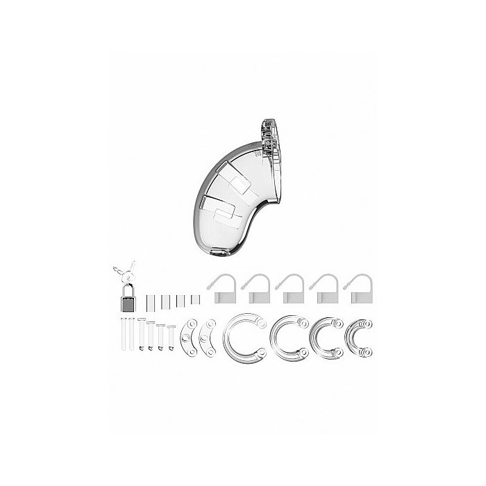 Bij de Mancage 01 Kuisheidskooi hoort een uitgebreide set aan diverse sleutels, pennen en slotjes. De kooi is volledig op maat te maken en bestaat uit drie delen die op elkaar aansluiten. Met een borgpen en ringen kun je zijn pik heel eenvoudig insluiten. Het is geen ingewikkeld bouwpakket hoor, in één handomdraai zet je hem vast. Er zitten overigens genoeg ventielatieopeningen in de kooi en plassen lukt ook prima. Wel zo handig en hygiënisch. Maar zijn seksuele lusten heb jij onder controle, en daar gaat het om tijdens dit spel.