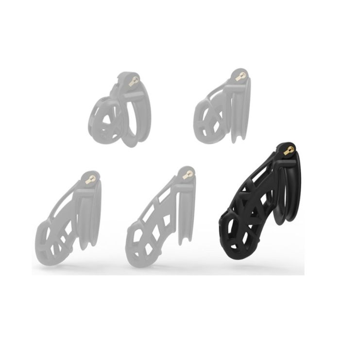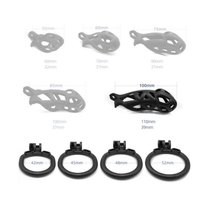 De kuisheidskooi heeft een stevige structuur die duurzaamheid en veiligheid garandeert tijdens het dragen. Met 4 ringen van verschillende diameters (42, 45, 48 en 52 mm) kan de gebruiker de perfecte pasvorm kiezen die het beste bij hem past, terwijl de sleutelsluiting zorgt voor een veilige vergrendeling.
