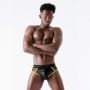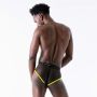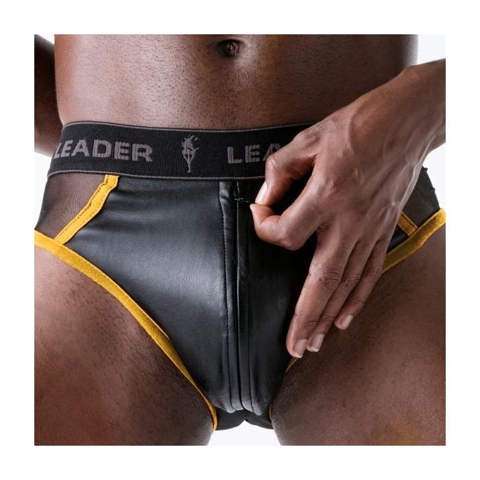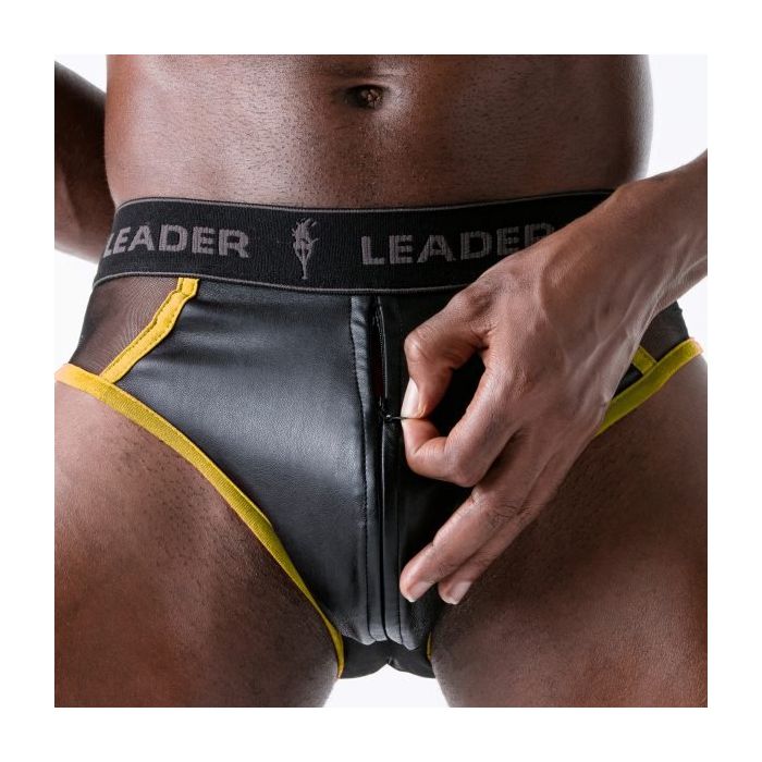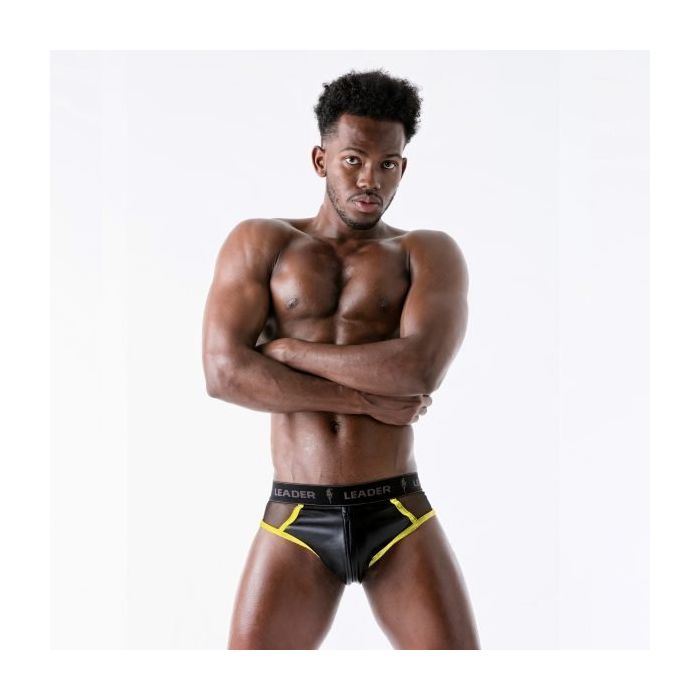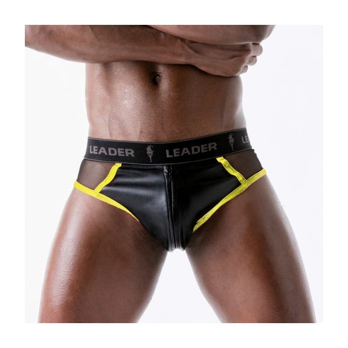 De kunstleren buidel is gemaakt van PVC voor een sexy leder look. In de voorkant is een rits gezet voor easy access. De zwarte slip is afgewerkt met een elastische Leader tailleband en zachte, gele zomen.