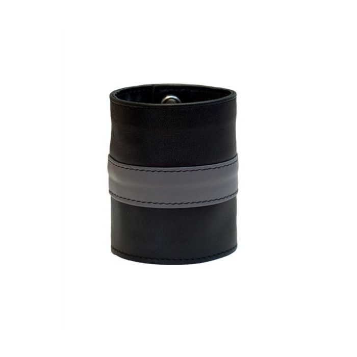 Voor elk feestje waarbij jij weinig tot niks aanhebt is deze leren polsband een echte uitkomst. Hij maakt je outfit niet alleen compleet maar hij is ook nog eens handig om je pasjes en geld in op te bergen. Het soepele leer zal fijn om je pols heen zitten en zal na elke keer een stukje fijner zitten. Deze polsband is voorzien van een grijze streep dus combineer het met je tevens Zwart / grijs gestreepte outfit. Hij sluit met drie drukknopen en is verkrijgbaar in verschillende maten.