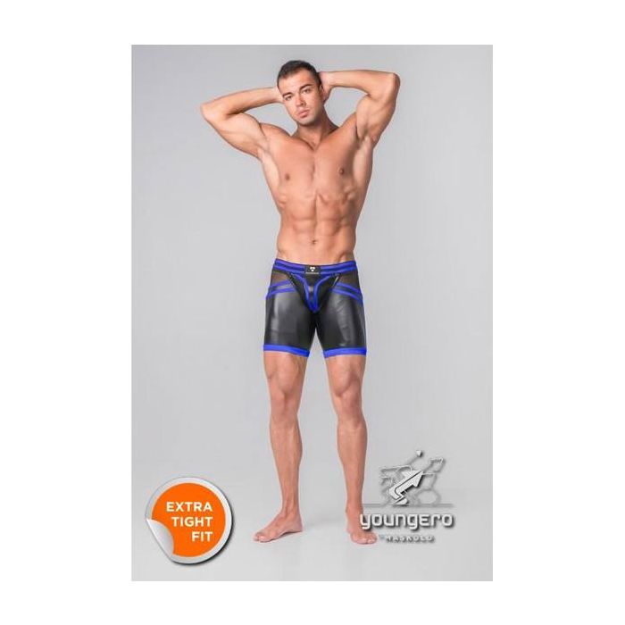 De Youngero Generation Y Shorts - Blauw van Maskulo is een fetisj stijl fietsbroek. De strakke short is gemaakt van hoge kwaliteit spandex met een hoge rekbaarheid. Het spandex ziet eruit als leer en wordt afgewisseld met elastiek en doorzichtig mesh. Deze combinatie ziet er heerlijk ruig uit.