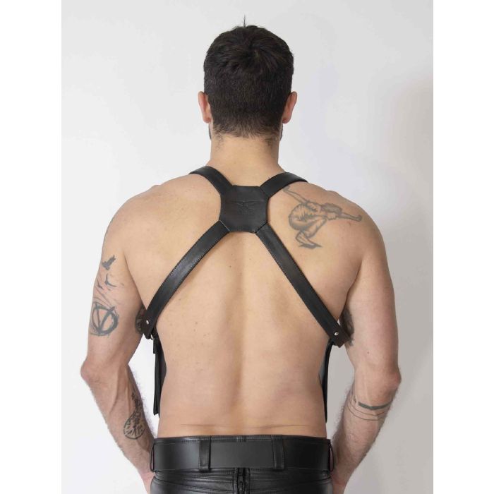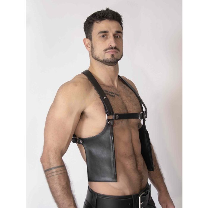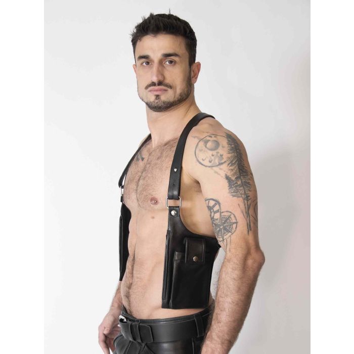 Het Mister B leren holsterharnas in zwart is een meesterwerk van hoogwaardig leer dat niet alleen sexy en veelzijdig is, maar ook ontworpen voor duurzaamheid. Dit harnas is de perfecte aanvulling op je garderobe, of je nu een gedurfde, edgy look wilt creëren met een leren ensemble of je casual outfit wilt opfrissen. Het unieke reliëf van het Mister B-logo benadrukt de kwaliteit en het karakter van dit statement piece, waardoor je altijd in het middelpunt van de belangstelling staat.