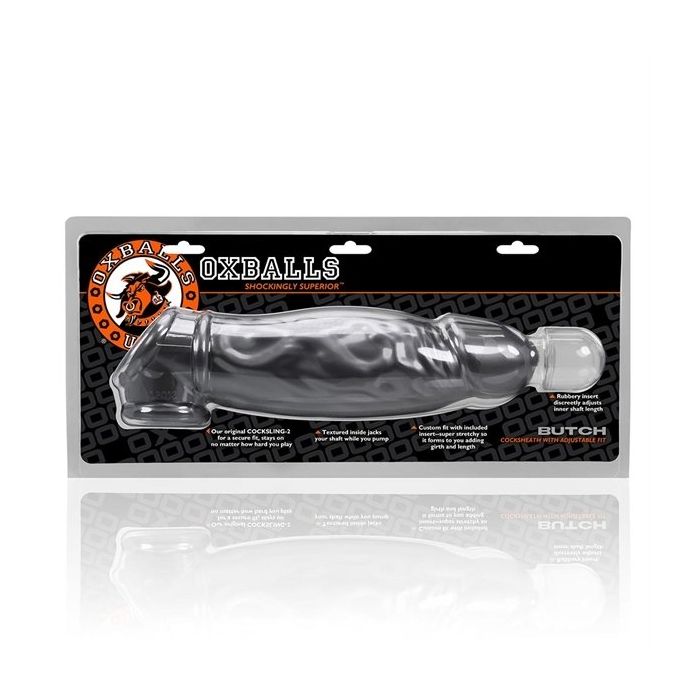 Transformeer je lul in een grote, dikke, geaderde neukstaaf met roestvrijstalen look. Met de Butch van Oxballs om kun jij de hele wereld aan. Niet alleen boost dit je zelfvertrouwen, het staat gewoon ook stoer en retegeil. De Butch geeft je meer lengte (maar liefst 5 cm en met de bullet zelfs 8 cm!), dikte... en een enorme boost voor je zelfvertrouwen. Stel je eens voor dat de jongens gebukt voor je in de rij gaan staan, want wie wil er nu niet genomen worden door deze paal.