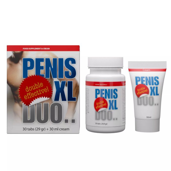 De Penis XL Duo Verpakking van Cobeco Pharmacy combineert tabletten en crème voor een optimale ondersteuning van het mannelijk geslachtsdeel en de erectie. De tabletten bevatten een uitgebalanceerd mengsel van actieve ingrediënten die de bloedtoevoer naar de penis stimuleren, wat bijdraagt aan een stevigere en grotere erectie. Tegelijkertijd verhogen ze het libido en ondersteunen ze potentie en seksuele lust.