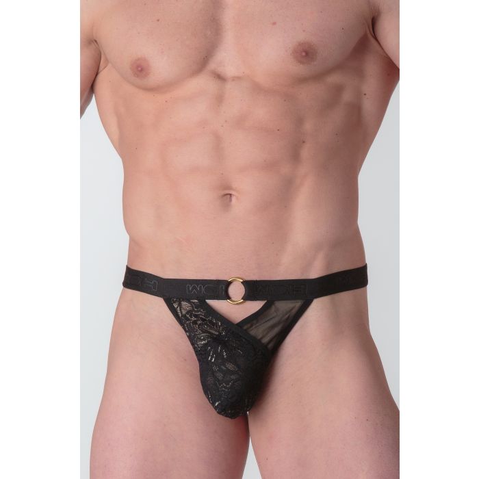 Deze thong is vervaardigd uit delicate zwarte en gouden kant, gecombineerd met een effen zwarte tule die perfect aansluit op je lichaam. Het ontwerp speelt subtiel met criss-cross materialen, waardoor een speelse schaduwspel ontstaat dat de nieuwsgierigheid prikkelt. Deze thong is niet alleen een kledingstuk, maar een statement dat je zelfvertrouwen en stijl uitstraalt.
