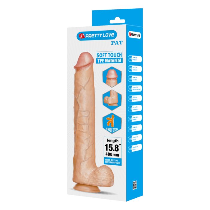 De Pretty Love Pat is een levensechte dildo van maar liefst 40 cm die is ontworpen voor een authentieke en plezierige ervaring. Gemaakt van hoogwaardig TPE-materiaal, biedt deze dildo een realistische huidtextuur en een anatomisch nauwkeurige vorm die perfect aansluit op jouw lichaam. De flexibele structuur maakt het mogelijk om de dildo in verschillende posities te gebruiken, zodat je jouw plezier kunt personaliseren. Dankzij de stevige zuignapbasis blijft de Pat veilig op gladde oppervlakken zitten, wat zorgt voor een zorgeloze en spannende ervaring, of je nu alleen speelt of samen met een partner. Het volledig waterdichte ontwerp maakt het ideaal voor gebruik in bad of douche, en het reinigen is een fluitje van een cent. Geniet van langdurig plezier met dit discreet ontworpen speeltje dat perfect is voor elke gelegenheid!