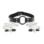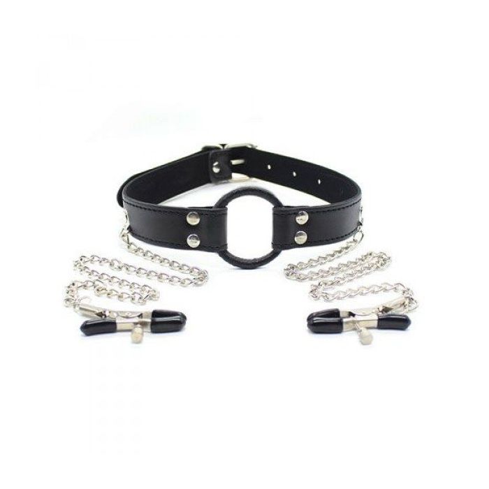 Deze ring gag met tepelklemmen is perfect voor bdsm spelletjes. De ring zorgt ervoor dat jij je mondje opent voor alles wat je meester erin wil stoppen en de tepelklemmen geven je tepels de pijn waar jij zo van houdt. De tepelklemmen zitten vast aan een robuuste ketting voor een kinky look. De tepelklemmen kan je aandraaien om te bepalen hoe strak ze komen te zitten en de rubberen nopjes beschermen de huid en voorkomen dat ze van de tepel afglijden.