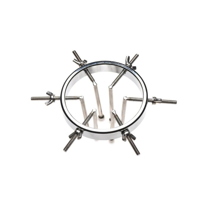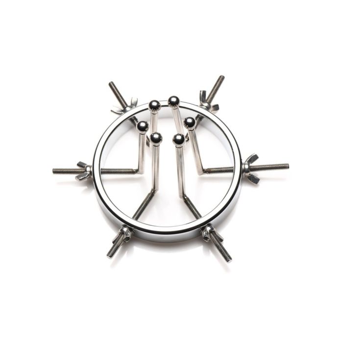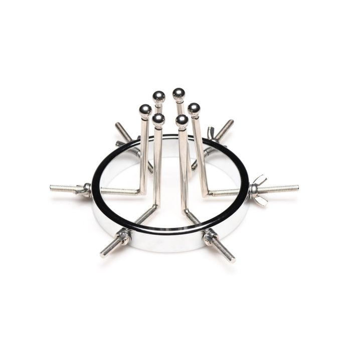De Anal Explorer bestaat uit een grote ring met een diameter van 10,5 cm en 6 dilatatoren met gladde staafjes met kleine, ronde balletjes aan de uiteinden. Steek het bijna 7,5 cm diep in en spreid hun gat wijd open! De ring is breed genoeg zodat je er ook je vuist doorheen kunt steken!