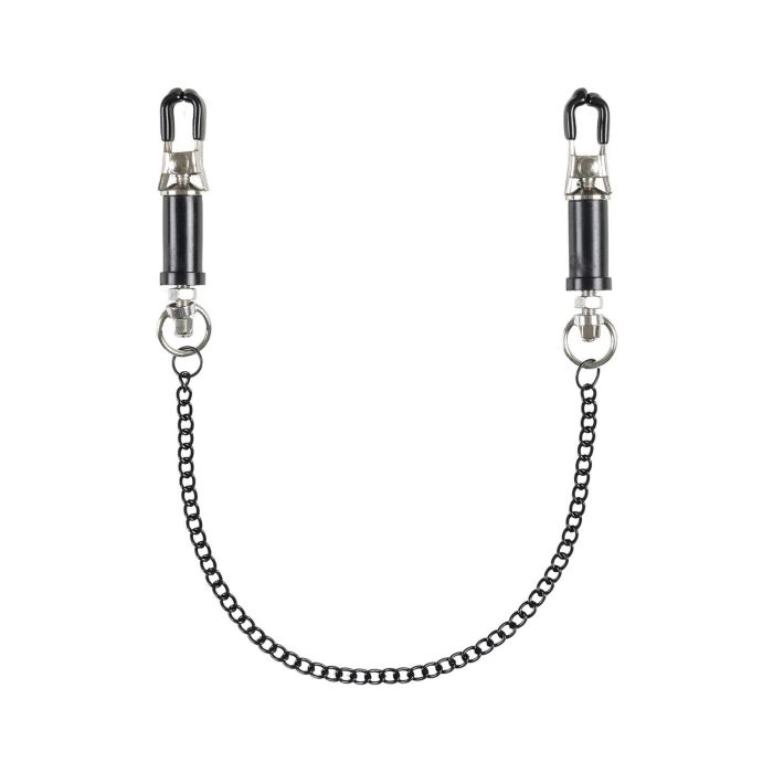 De elegante ketting die de klemmen met elkaar verbindt, eindigt in een prachtige zwarte hanger die een extra vleugje glamour toevoegt aan je intieme momenten.