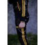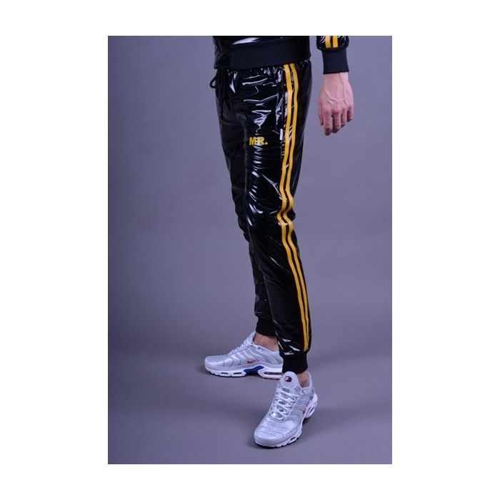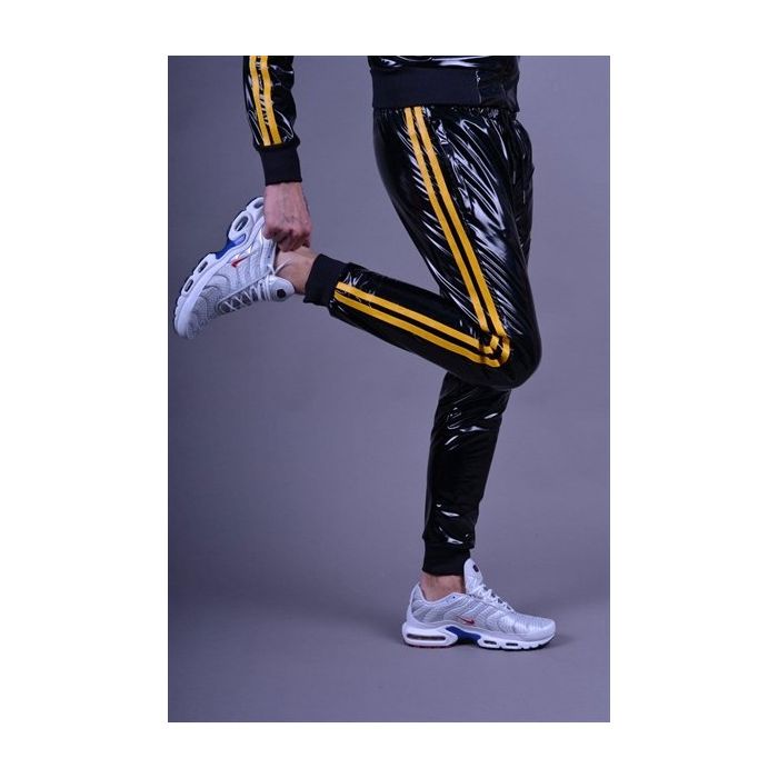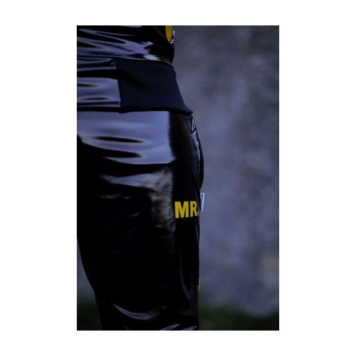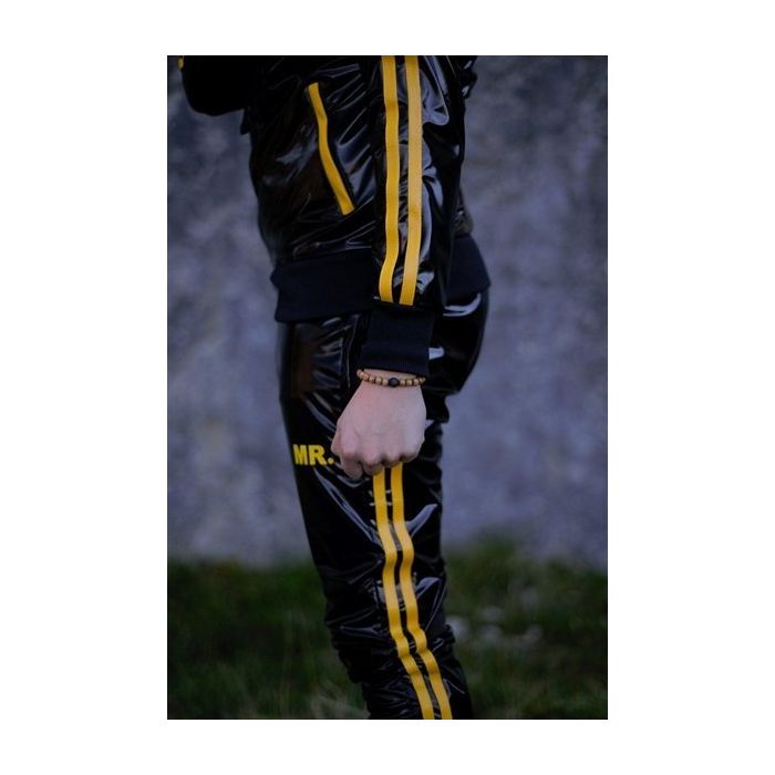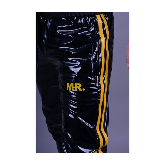 Deze stoere trainingsbroek Mr Riegillio - Geel is gemaakt van PVC materiaal wat lekker aanvoelt. De trainingsbroek heeft twee zijzakken, een tailleband, gele strepen op de zijkanten en een gele MR. logo op het linkerbeen.