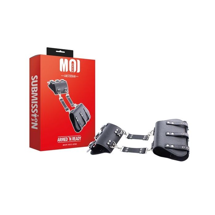 De armboeien van Moi Submission zijn gemaakt van imitatieleer en zijn gemakkeljik in gebruik. De boeien zijn eenvoudig op maat te maken dankzij de handige gespsluitingen. Bevestig de boeien aan elkaar d.m.v. de dubbele ketting van imitatieleer.