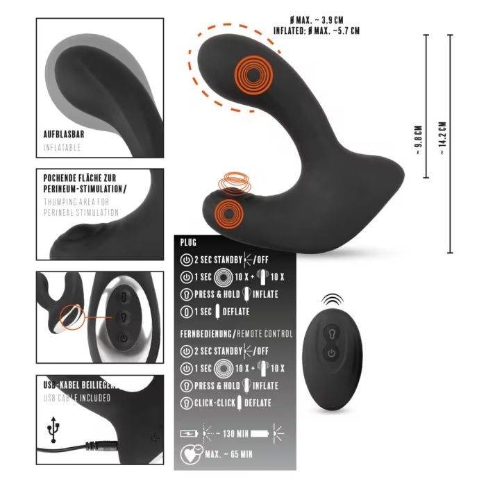De perfect gevormde vibrerende anaal plug van Rebel heeft drie krachtige motoren die zorgen voor anaal genot. Met één druk om de knop van de afstandsbediening kan de buttplug worden opgeblazen voor een intens vol gevoel. De 10 vibratiestanden, luchtdrukontspanningsfunctie en de pulserende tikstanden zijn eenvoudig te bedienen met de meegeleverde afstandsbediening. Je hebt een bereik van 8 meter. Is de buttplug leeg? Laad hem dan gemakkelijk met de oplaadkabel.