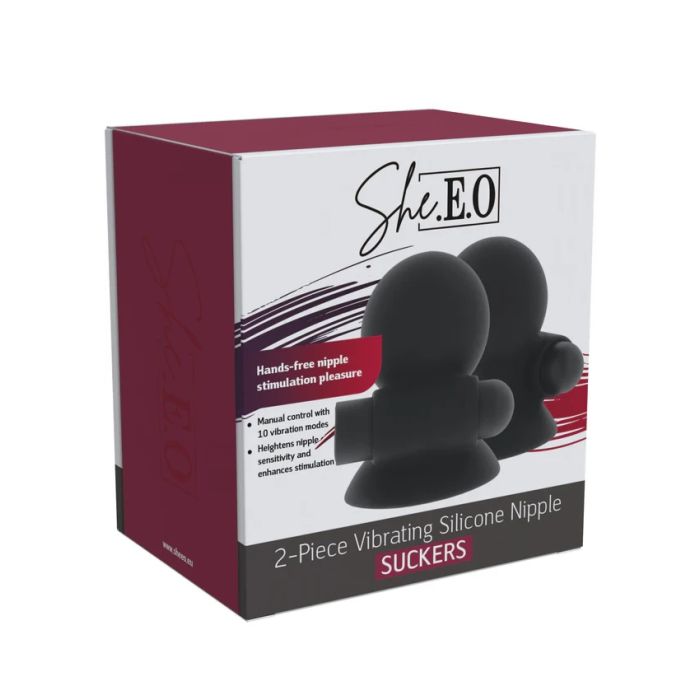 De She.E.O Vibrerende Tepelzuigers is de ultieme combinatie van zuiging en vibratie die je zintuigen op een ongeëvenaarde manier prikkelt! Gemaakt van lichaamsveilig silicone, bieden deze tepelspeeltjes een comfortabele vacuümverzegeling met slechts een simpele druk. De ingebouwde vibraties verhogen niet alleen de gevoeligheid, maar brengen je ook naar nieuwe hoogten van genot. Met meerdere vibratiestanden kun je de intensiteit eenvoudig aanpassen aan jouw persoonlijke voorkeur, zodat je de controle hebt over je eigen plezier. Deze tepelspeeltjes zijn ontworpen voor handsfree genot, wat betekent dat je ze gemakkelijk kunt dragen en gebruiken zonder gedoe. Het verwijderen van de vacuümverzegeling is een fluitje van een cent; til gewoon de rand op en je bent klaar. Bovendien zijn ze waterproof en eenvoudig schoon te maken, waardoor ze perfect zijn voor iedereen die extra sensatie aan hun tepelspeelervaring wil toevoegen. Verwen jezelf of je partner met deze innovatieve en opwindende toevoeging aan je collectie en ervaar een nieuwe dimensie van plezier!