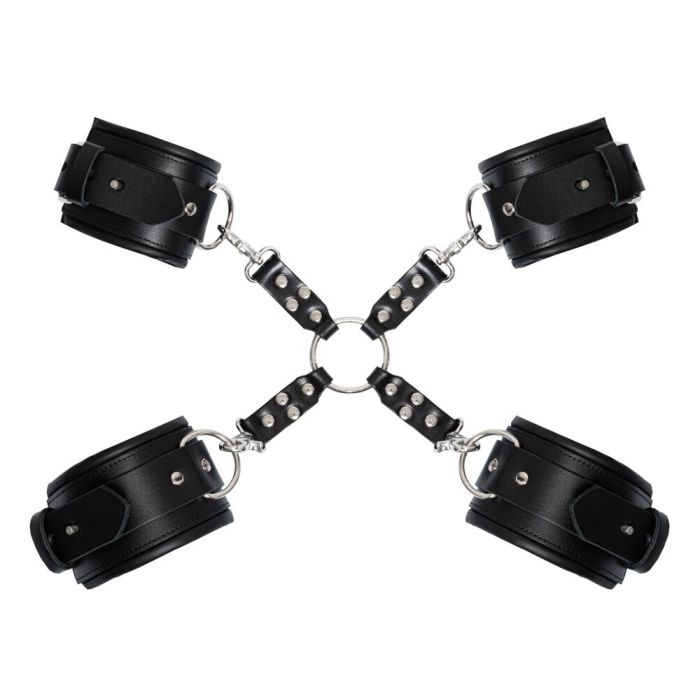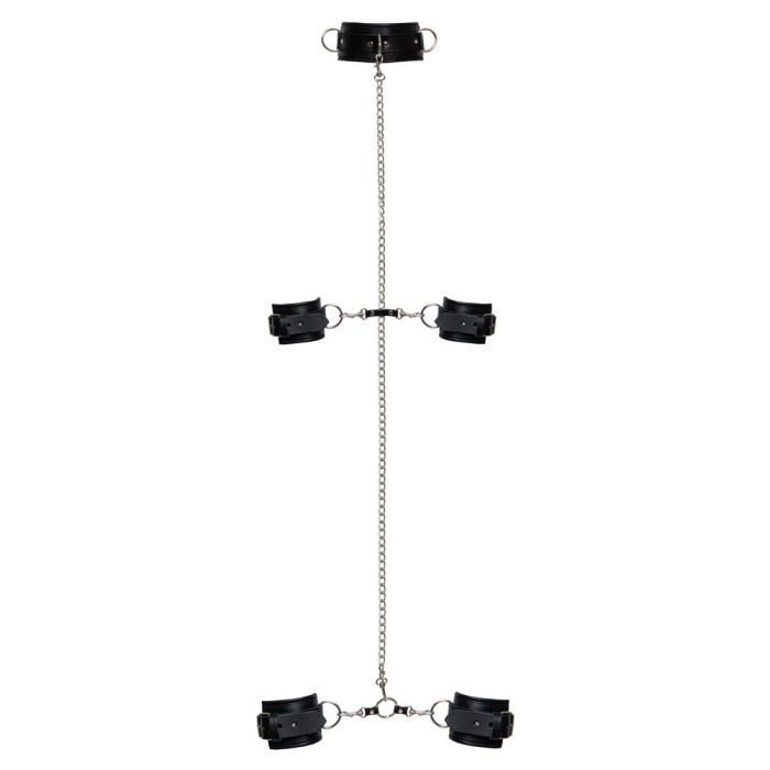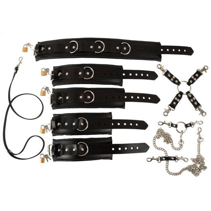 De Zado Professionele Complete Bondage Bevestigingsset, de perfecte keuze voor de echte liefhebber van bondage! Gemaakt van luxe zwart leer en voorzien van stijlvolle zilverkleurige accessoires, biedt deze set alles wat je nodig hebt voor spannende en veilige avonturen. Met een nekboei, handboeien, enkelboeien, hogtie en een lange karabijnketting kun je eindeloos experimenteren met verschillende posities en fantasieën.